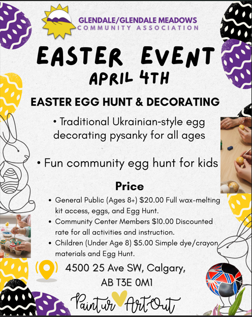- General Public (Ages 8+) $20.00 Full wax-melting kit access, eggs, and Egg Hunt.